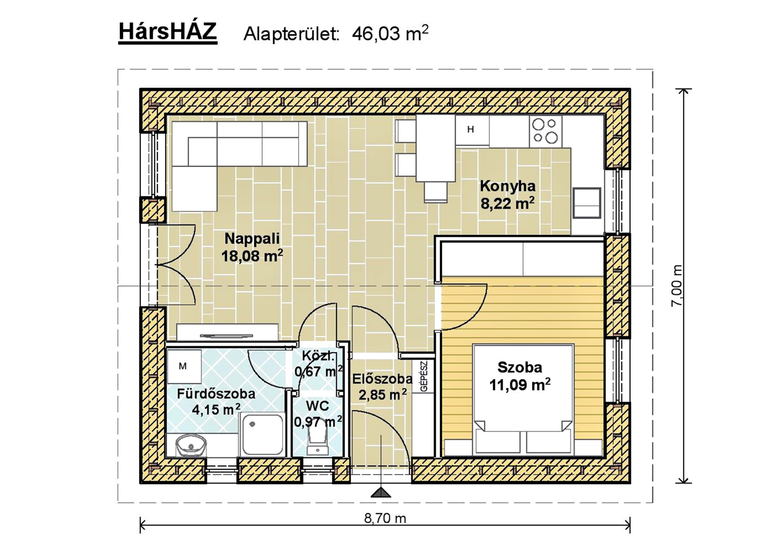 Ez a 46,03 m2 hasznos alapterületű HÁRS Kendercell mintaház kis alapterületű, praktikus otthon, tökéletes választás, ha egy energiatakarékos és költséghatékony otthonban gondolkodsz. A kis alapterület ellenére a tervezés során maximálisan kihasználtuk a rendelkezésre álló teret, így egy jól átgondolt, kényelmes lakótér jött létre.